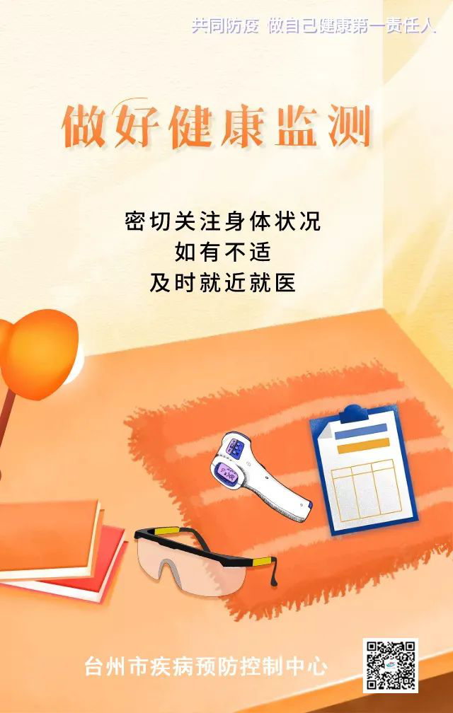 5、倡导旅游返台后进行一次核酸检测,并做好14天的自我健康观察,一旦出现发热、咳嗽、咽痛、乏力等身体不适症状时,要佩戴医用口罩,及时到附近发热门诊就医,并主动向医生报告旅居史,就医途中避免乘坐公共交通工具。